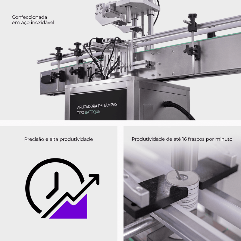 Com a combinação perfeita entre precisão e alta produtividade, a Aplicadora de Tampas é capaz de pressionar ou empurrar tampas e produtos que necessitem de aplicação de compressão. A máquina também oferece versatilidade, podendo ser integrada a outras máquinas da Cetro, como: Dosadoras, Envasadoras, Máquinas de Recrave, Rotuladoras, Datadores, Montadoras de Caixas, Fechadoras de Caixas e Enfardadeiras.
