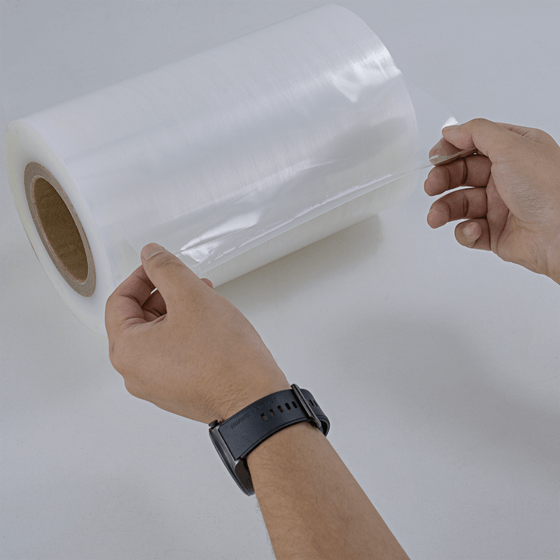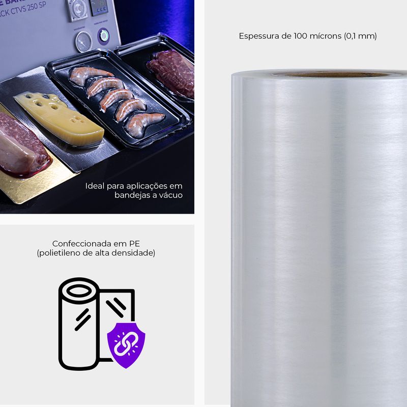 PE (Polietileno) com espessura de 100 mícrons, um material prático e maleável que facilita a ativação da bobina durante o processo de aquecimento e vácuo dentro da câmara. Assim, o filme se molda perfeitamente ao item na bandeja, criando um acabamento 3D.