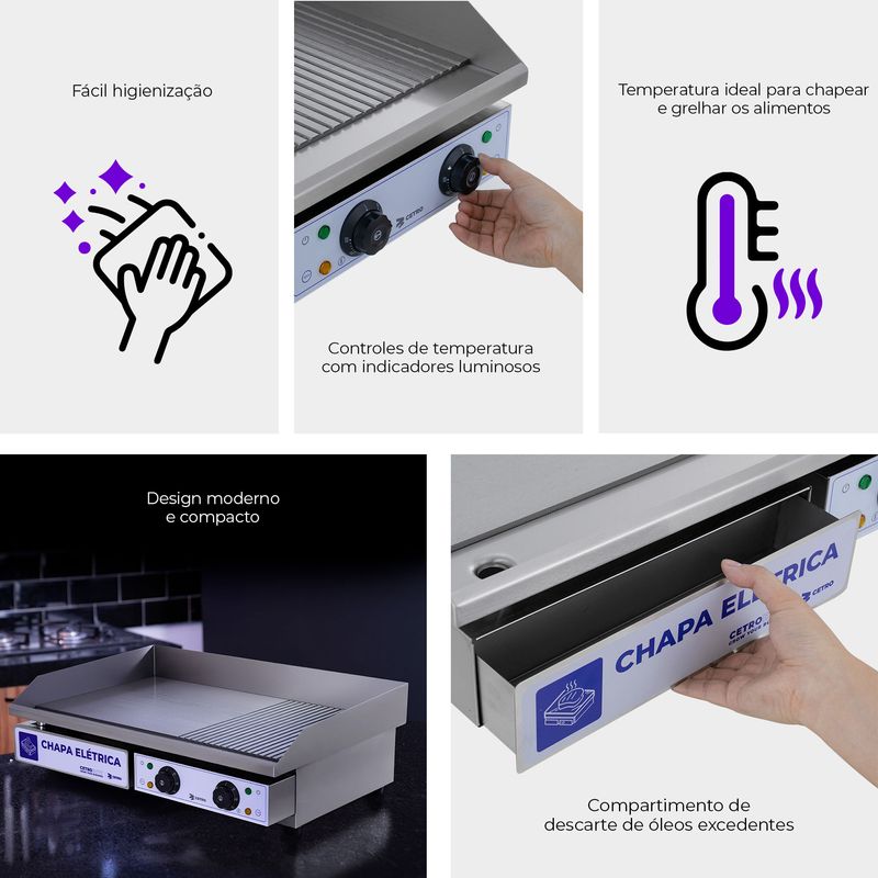 Para quem exige alto desempenho no dia a dia, a Chapa com Grelha Elétrica em Inox com 2 Queimadores CFGM EG-7340 TBG da Cetro entrega muito mais que aquecimento: ela oferece confiança, durabilidade e praticidade em cada uso.