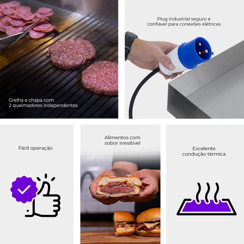 Com dois queimadores individuais para preparar receitas diversas, chapeie e grelhe carnes, legumes, condimentos e outros alimentos de forma rápida e prática.