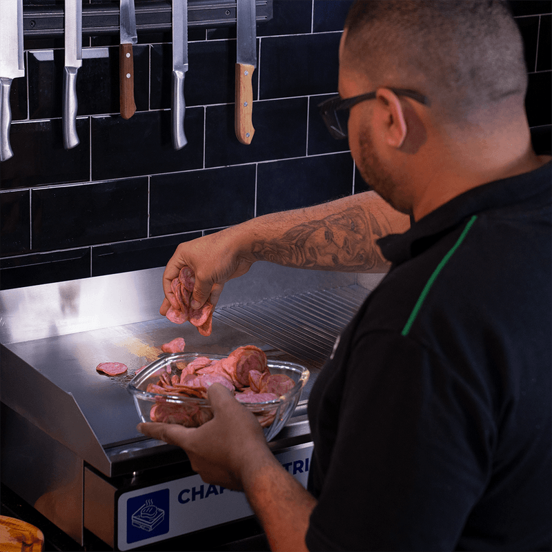Trabalhe continuamente e sem interrupções. Com um sistema de escoamento integrado para descartar as gorduras e os líquidos excedentes do preparo, a Chapa contribui para uma operação mais higiênica, segura e prática no dia a dia.