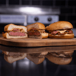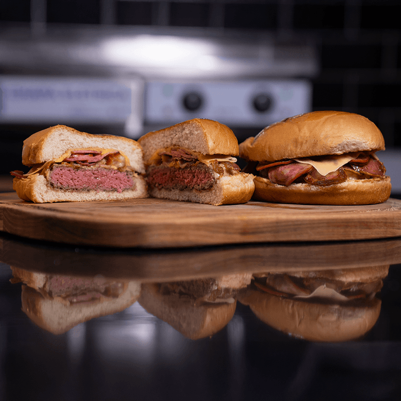 Prepare hambúrgueres, ovos fritos, calabresa e pães chapeados