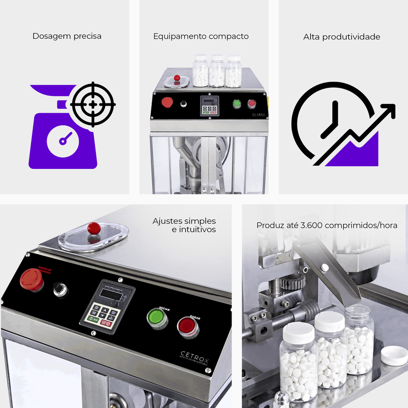 A Compressora Automática de Comprimidos da Cetro é ideal para atender as demandas de diversos setores do ramo da saúde, como: farmacêutico, suplementos, vitaminas, entre outros. Esse modelo permite produzir vários tamanhos de comprimidos redondos de forma otimizada e prática.