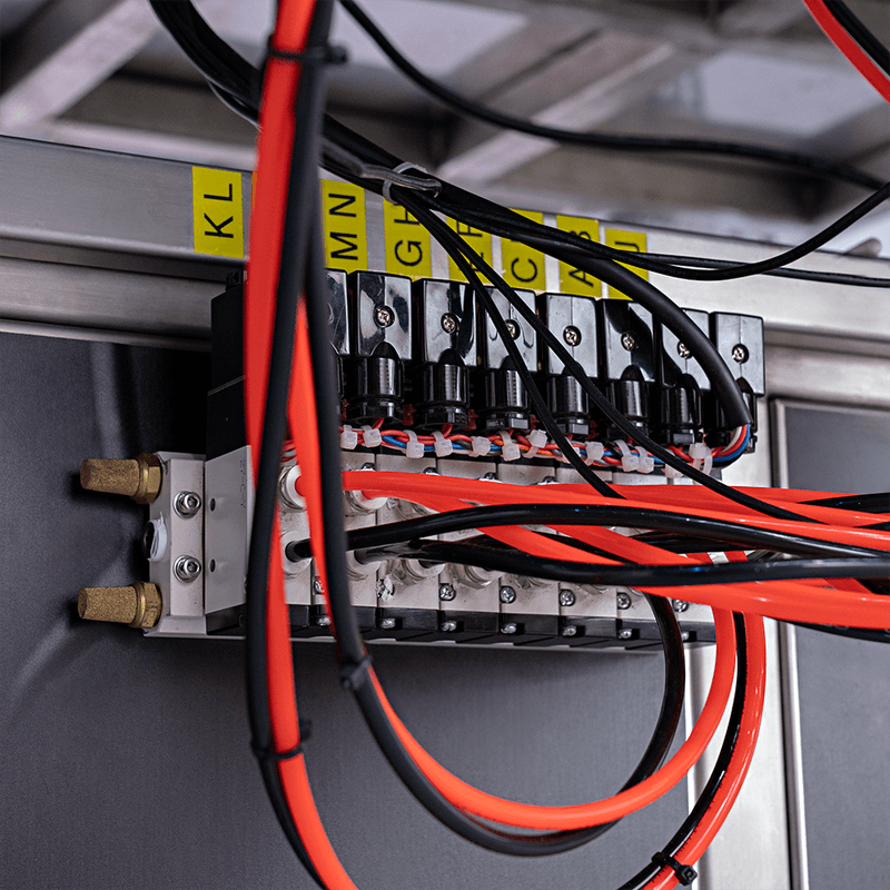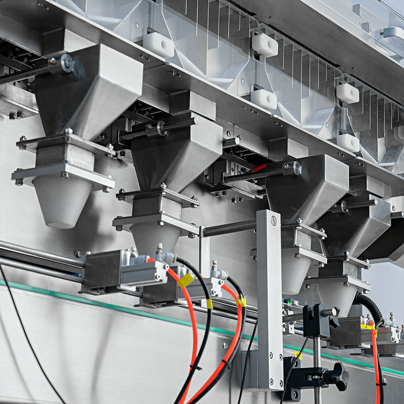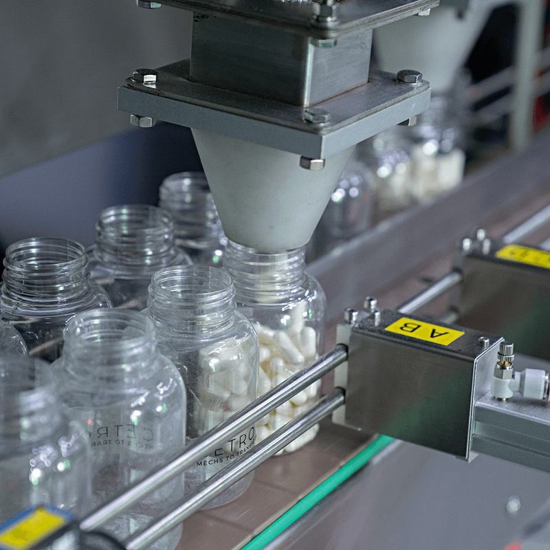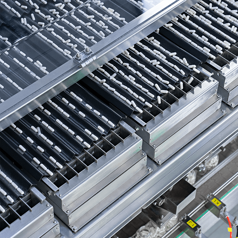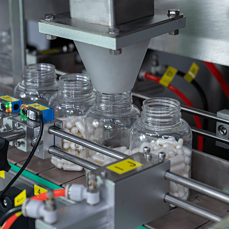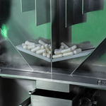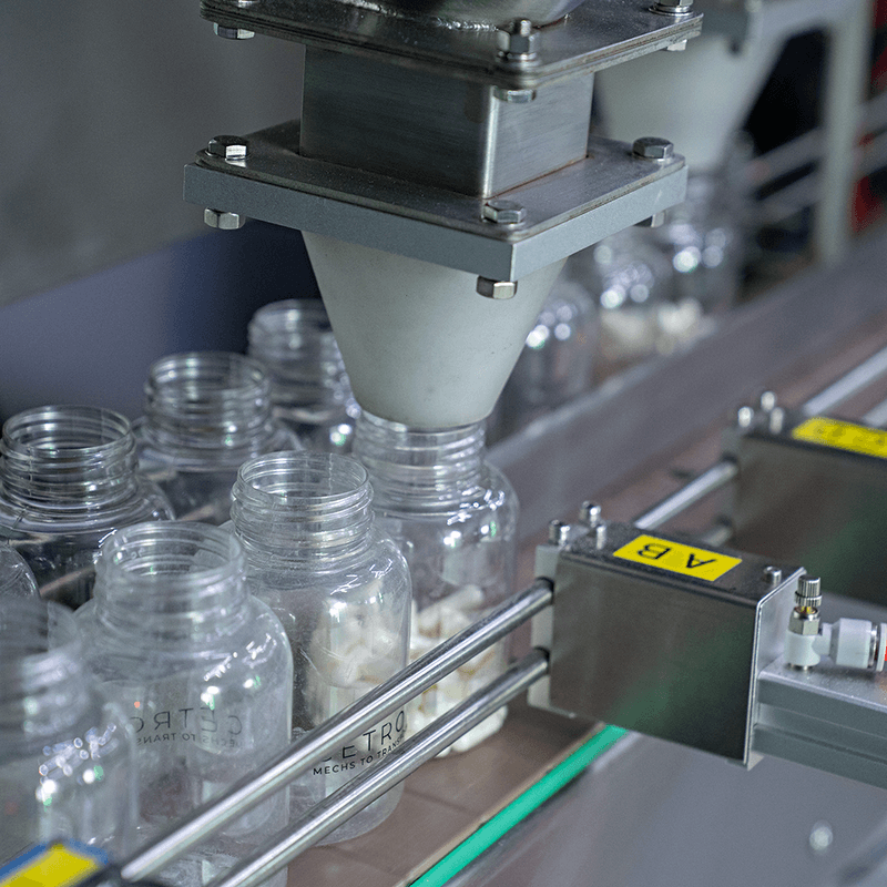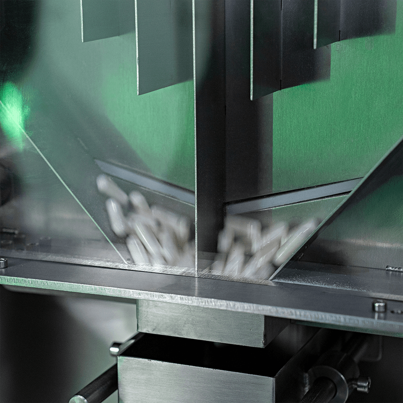 As cápsulas ou gummies entram pela cuba de abastecimento e, através da vibração dos trilhos, são encaminhados até uma câmara. Um sensor fotoelétrico inicia a contagem para, em seguida, envasar a quantidade programada em frascos.