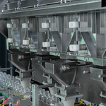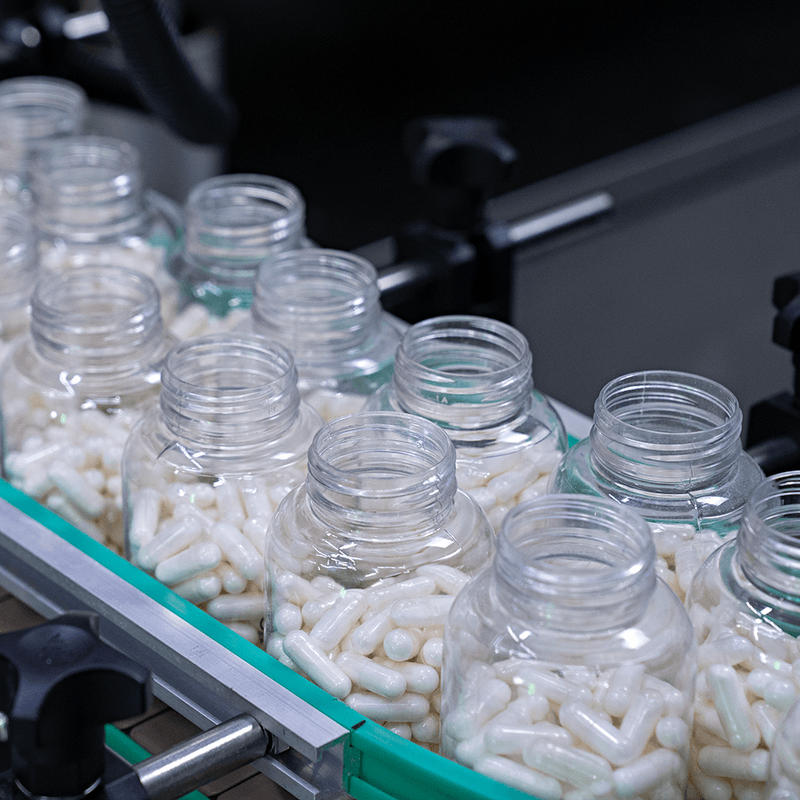 Com uma mesa abastecedora na entrada da CACM CF L-32 (opcional), a esteira pode ser abastecida com frascos automaticamente. Assim, estes recipientes serão transportados pela esteira até o funil de envase, onde serão envasados com as cápsulas ou gummies de forma automática.