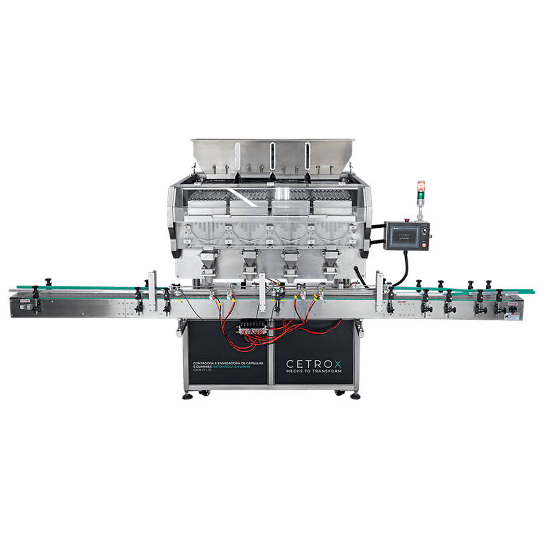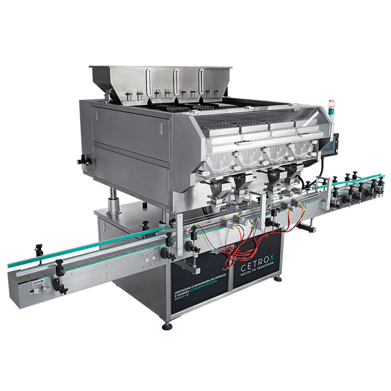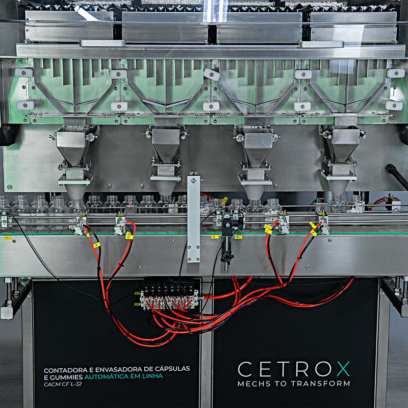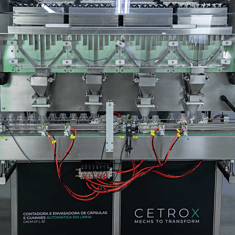 A Contadora e Envasadora de Cápsulas e Gummies Automática em Linha CACM CF L-32 da Cetro é uma máquina inteligente com capacidade de contar a quantidade exata de produto e envasar no frasco automaticamente.