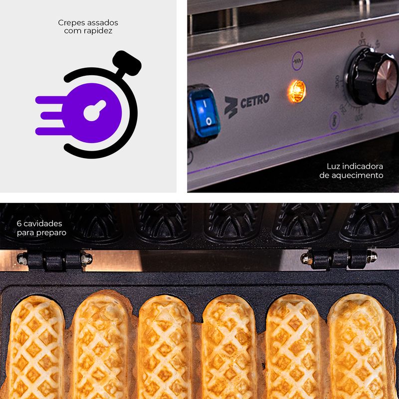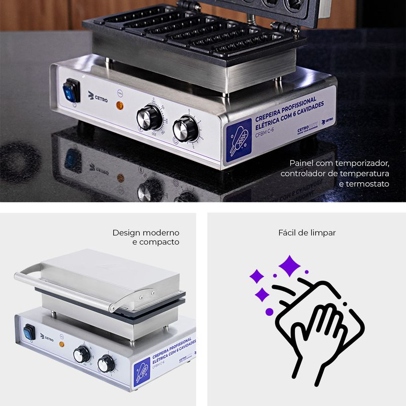 Se os pedidos estão chegando depressa, as 6 cavidades bem definidas da Crepeira Profissional são a solução! Ela é feita de materiais resistentes e fáceis de limpar, que permitem entregar preparos excelentes por muito tempo.