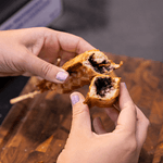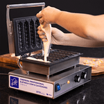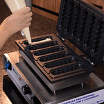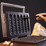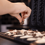 Unte as cavidades da Crepeira, adicione a massa e os recheios do crepe, posicione bem os palitos de madeira e feche a tampa com segurança utilizando o puxador auxiliar.