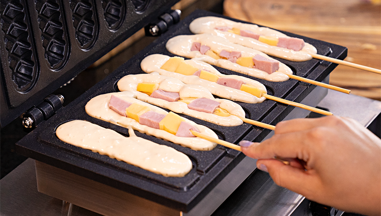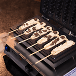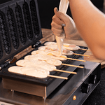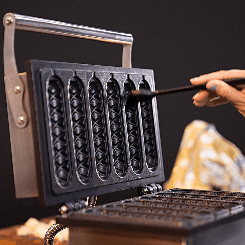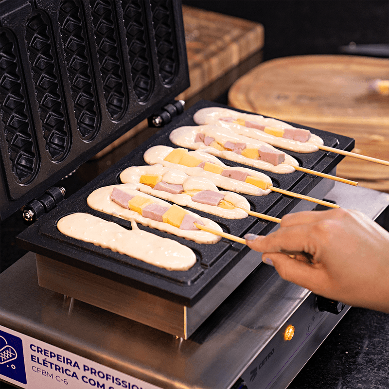 Unte as cavidades da Crepeira, adicione a massa e os recheios do crepe, posicione bem os palitos de madeira e feche a tampa com segurança utilizando o puxador auxiliar.