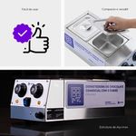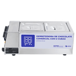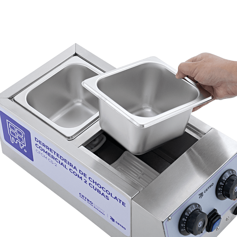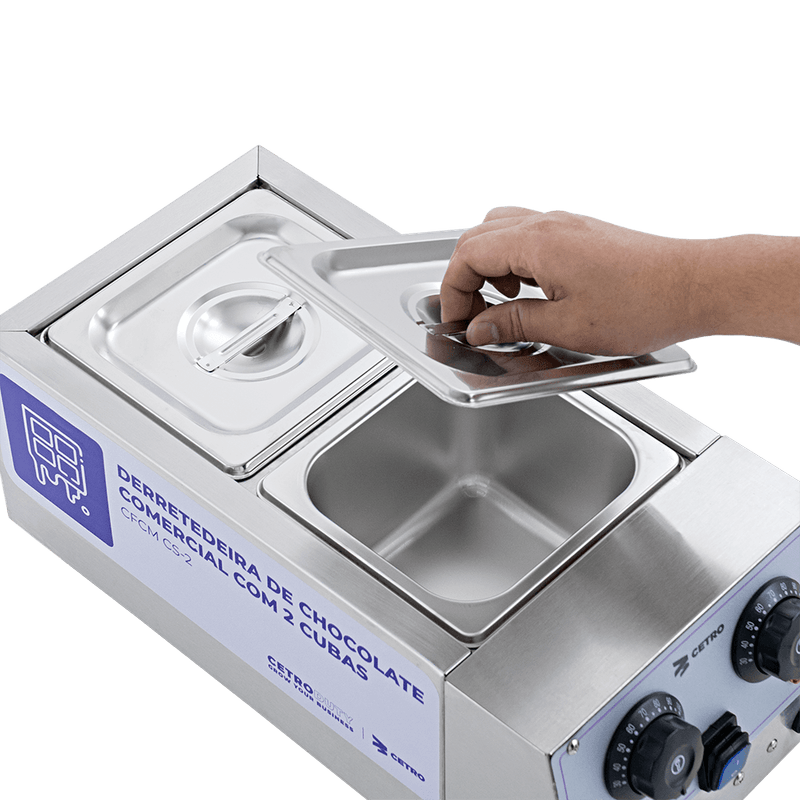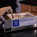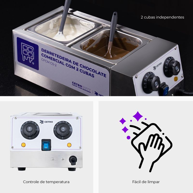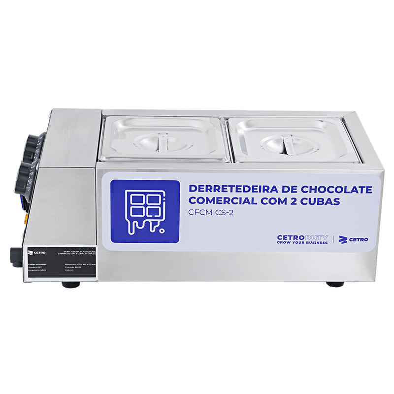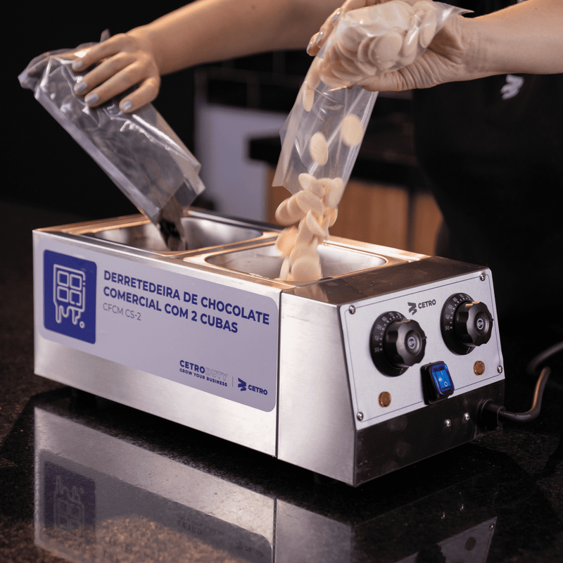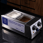 Com 2 cubas amplas, esse equipamento pode derreter uma variedade de produtos, desde chocolates ao leite, branco ou meio amargo até coberturas fracionadas, queijos cremosos, geleias e outros doces pastosos.