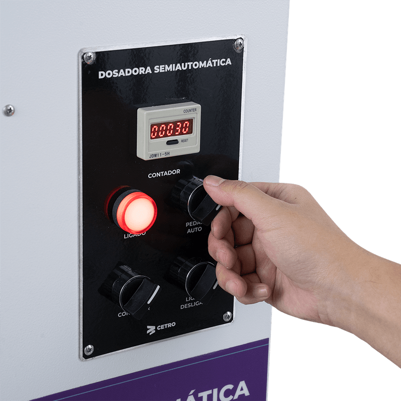 O ajuste da medida de dosagem feito por caneca é simples e garante que a máquina consiga dosar sempre a mesma quantidade, evitando grandes variações no volume dosado e desperdício de produtos. Seu modo de operação é acionado por pedal, o que é facilmente controlado pelo operador, tornando o processo de escoamento do produto muito mais prático.