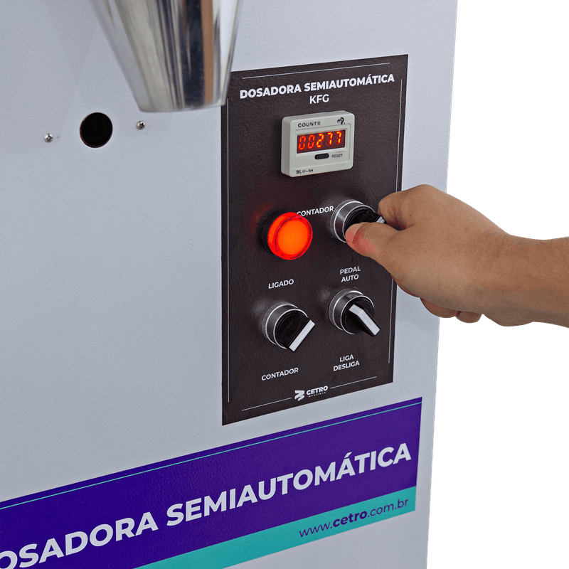 O ajuste da medida de dosagem feito por caneca é simples e garante que a máquina consiga dosar sempre a mesma quantidade, evitando grandes variações no volume dosado e desperdício de produtos. Seu modo de operação é acionado por pedal, o que é facilmente controlado pelo operador, tornando o processo de escoamento do produto muito mais prático.