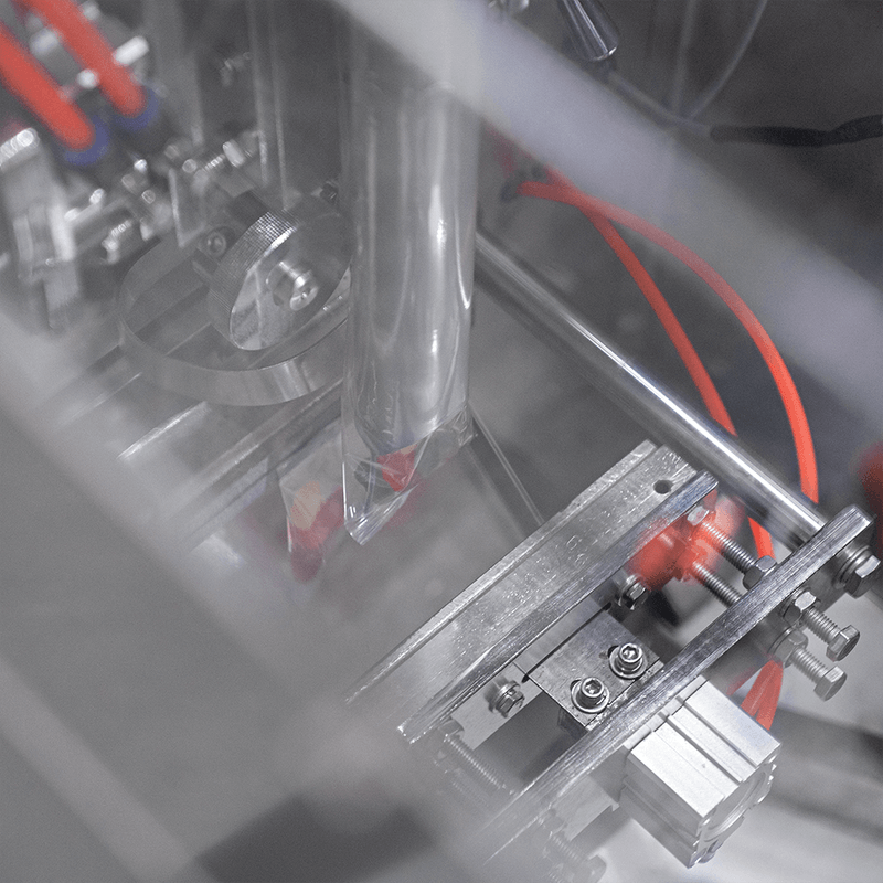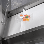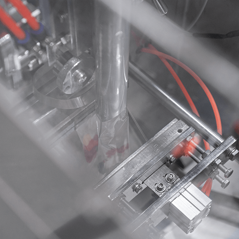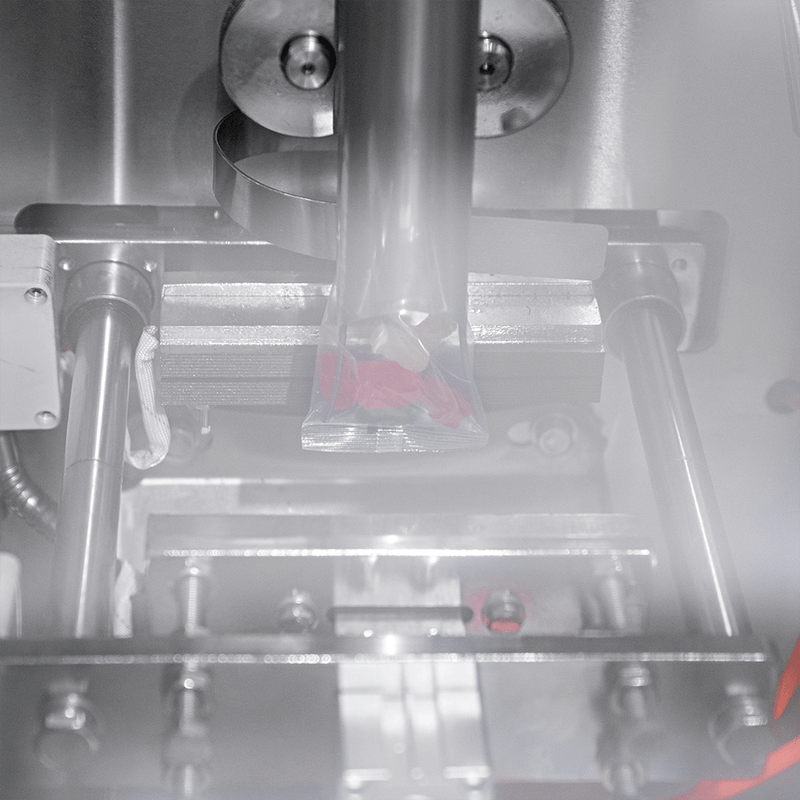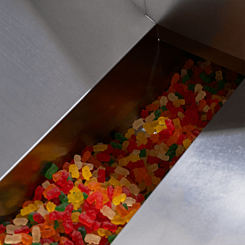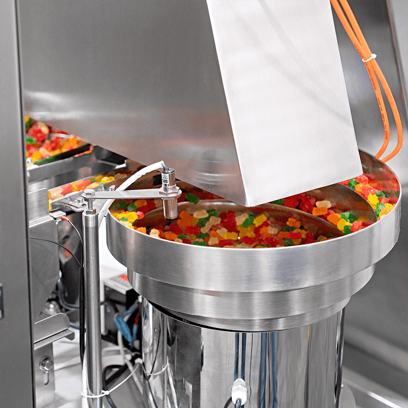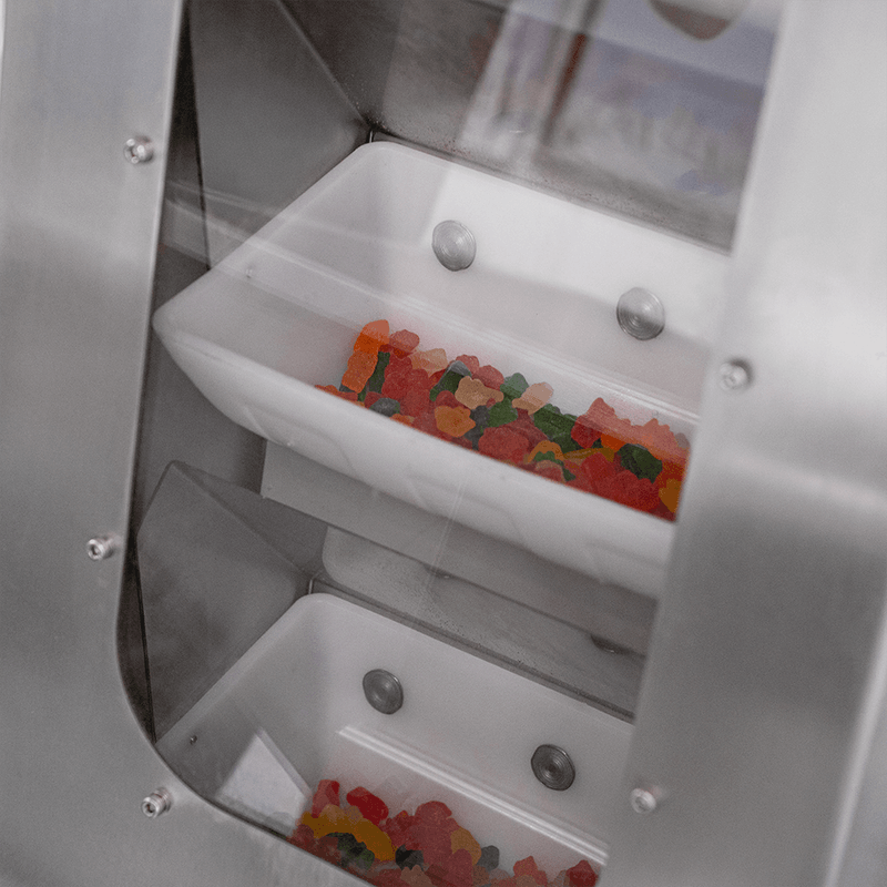 fluxo estável e constante.Dentro da Empacotadora, os gummies passam pelo