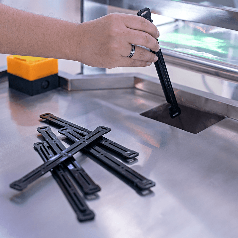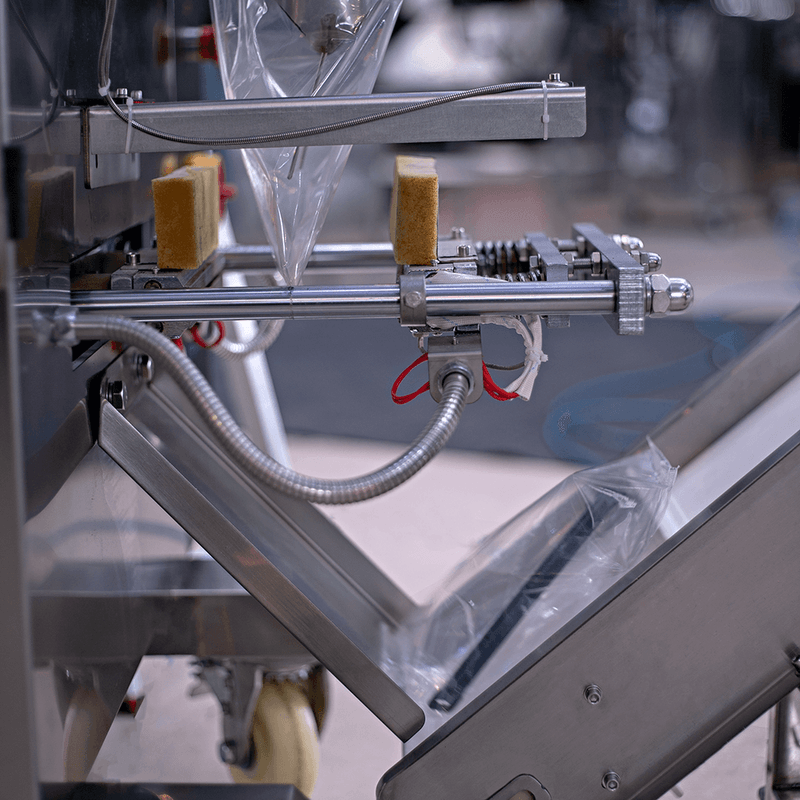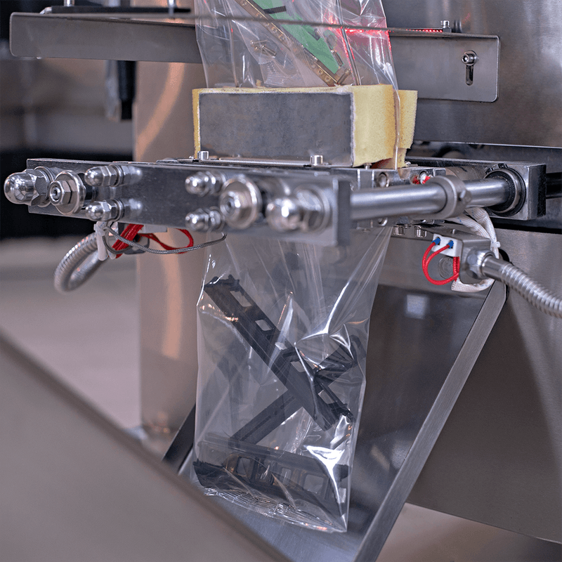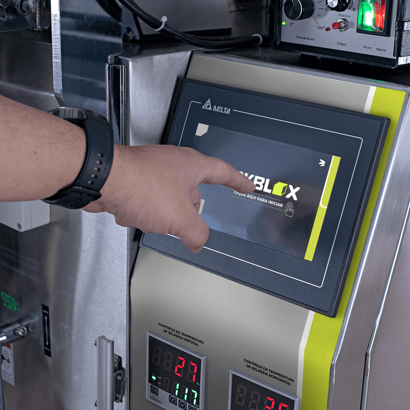 Em seguida, a embalagem é selada automaticamente em duas extremidades e cortada. O datador automático, então, imprime informações fundamentais na embalagem de forma inviolável, como data de validade e lote.