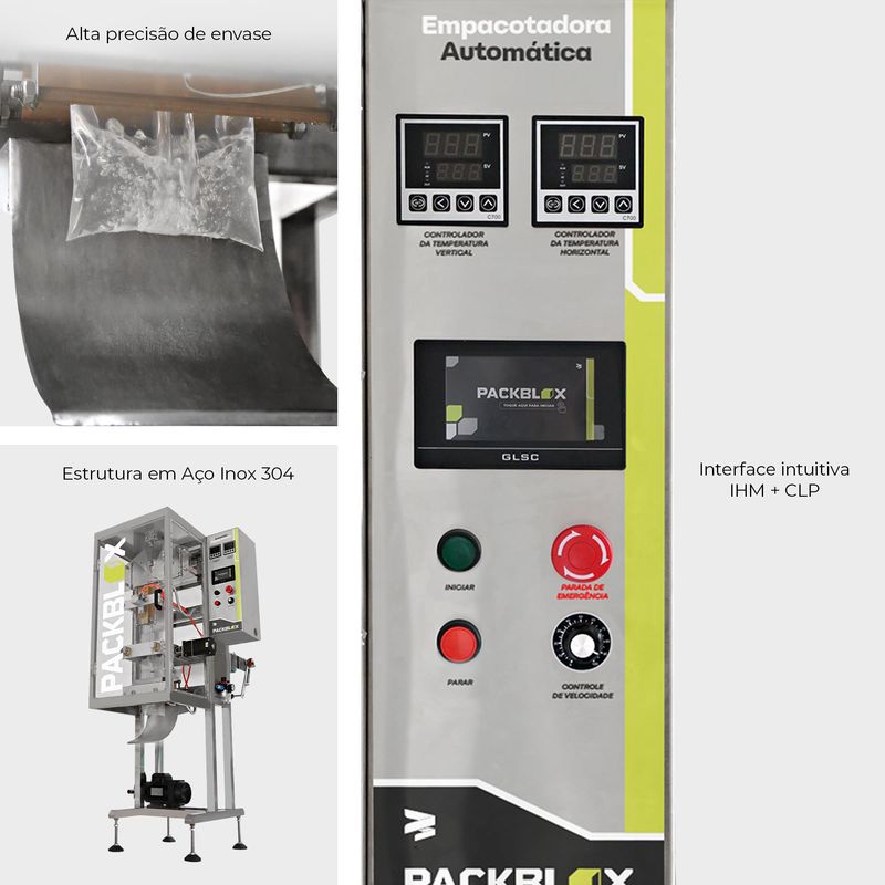 A embalagem back-seal é formada por um sistema vertical automatizado e o envase, a selagem e o corte são realizados com precisão e agilidade. Sua estrutura em aço inoxidável 304 é resistente à corrosão e fácil de limpar, ideal para operações com alimentos e químicos.