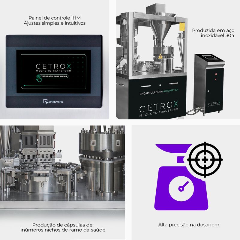 A Encapsuladora da Cetro é compacta e completamente automática, tem um design avançado e atende a indústrias farmacêuticas, universidades e inúmeros nichos do ramo da saúde que trabalham com cápsulas. Além disso, a máquina é compatível com moldes de cápsulas nos tamanhos 00L#, 00#, 0L#, 0#, 1#, 2#, 3# e 4#.