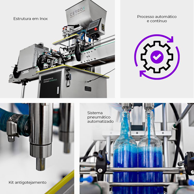 molhos, condimentos, shampoos, cremes, suplementos, amaciantes, entre outros.ESTRUTURA EM INOXA Envasadora da Cetro é produzida com materiais de alta qualidade, garantindo higiene e segurança no envase. As partes em contato com o produto são feitas em