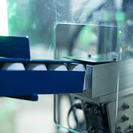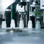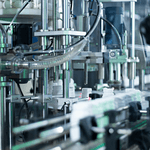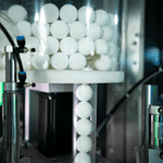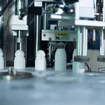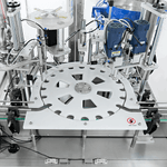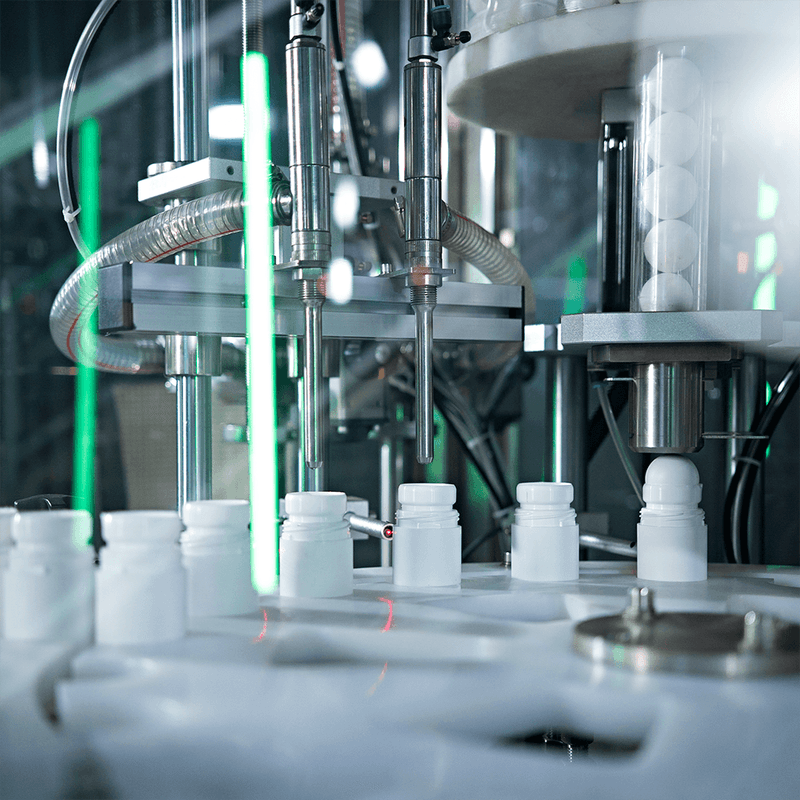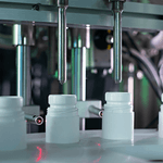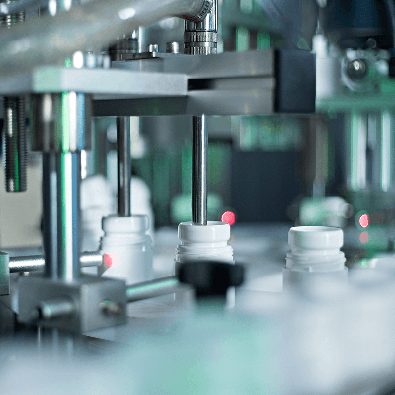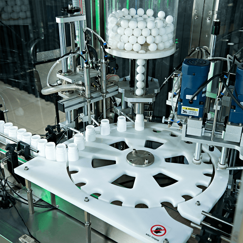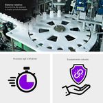 4 processos de forma sequencial e contínua: transporte dos frascos pela esteira, envase do produto, depósito da esfera dentro do frasco e rosqueamento de tampas.
