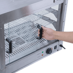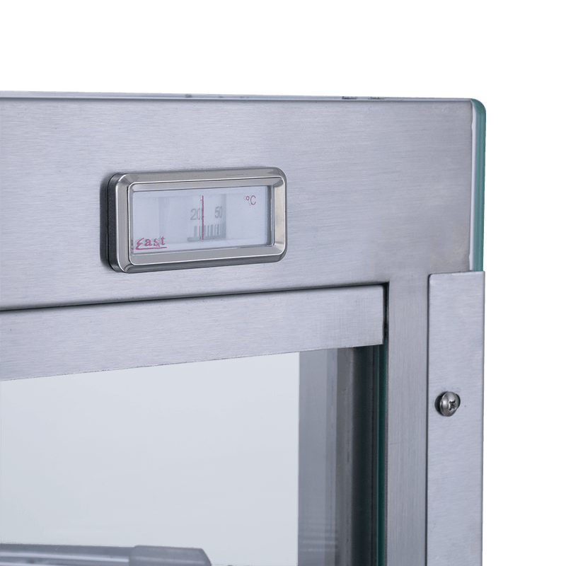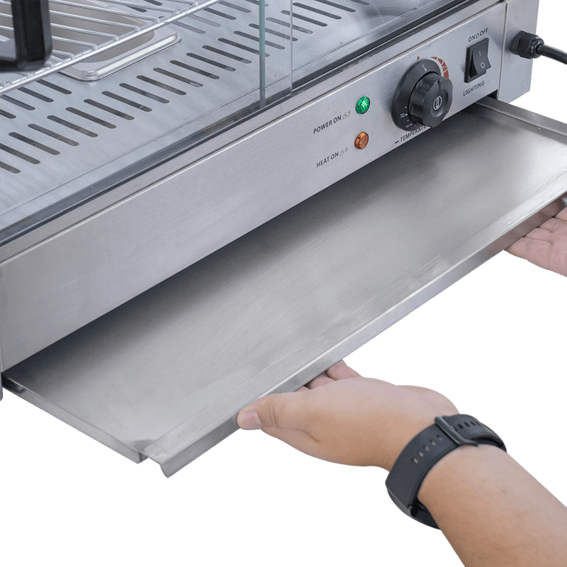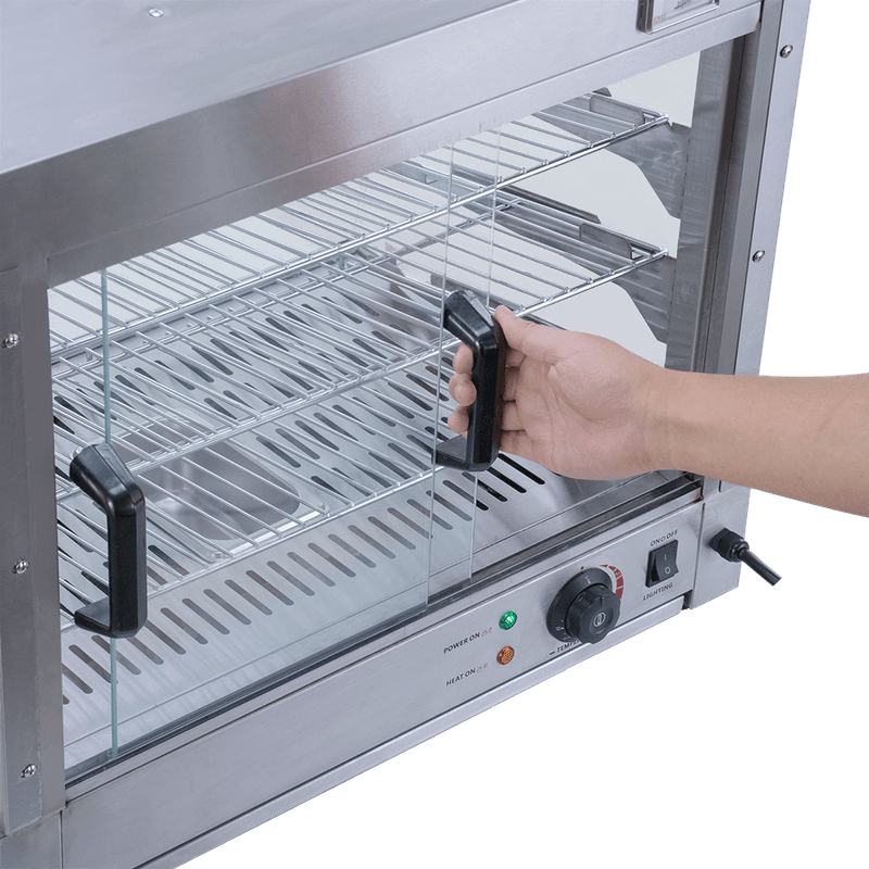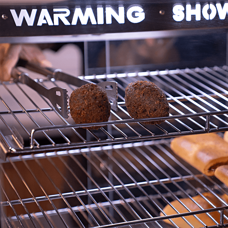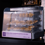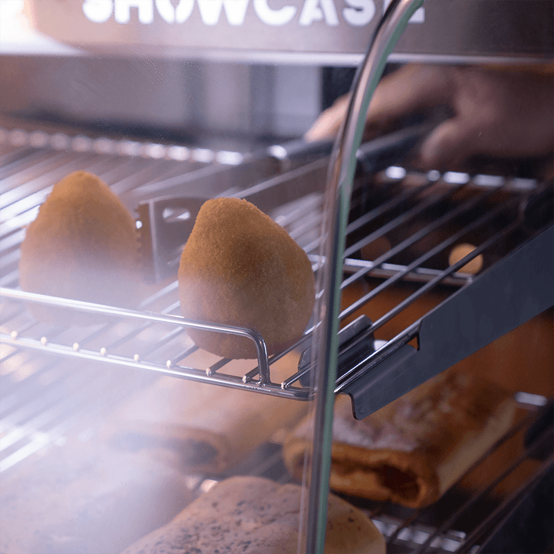 Feche as portas da Estufa e mantenha o calor em seu interior. Quando os clientes fizerem o pedido, basta deslizar a porta para abri-la e pegar os salgados com facilidade e segurança.