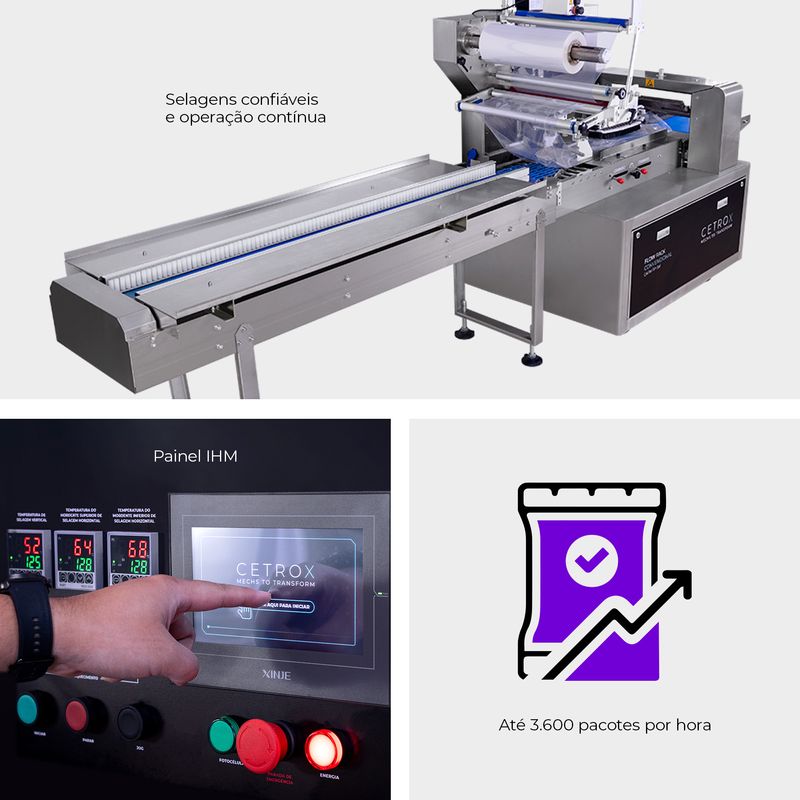 ajuste do comprimento do pacote, o controle fino da velocidade e o acesso rápido às receitas pré-programadas, otimizando a operação para diferentes produtos e tamanhos de embalagens.
