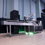 esteira adicional de alimentação, responsável por encaminhar os produtos até a esteira principal do equipamento, onde o filme é aplicado.