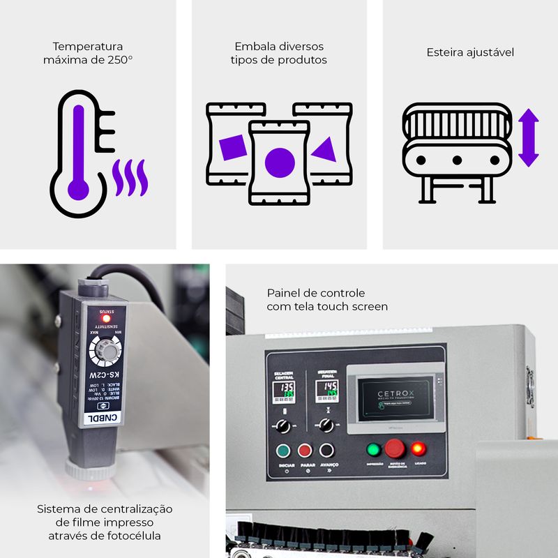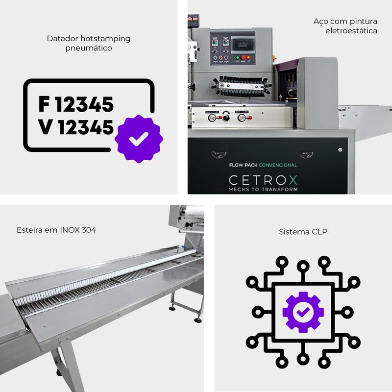 Perfeita para grandes indústrias, a seladora Flow Pack da Cetro atende inúmeros mercados de produtos alimentícios, sendo possível embalar produtos como pães, pão de queijo, pão de mel, hambúrgueres, doces, bolachas, bolinhos, doce de leite, paçoca, barras de chocolate, frutas e muito mais.