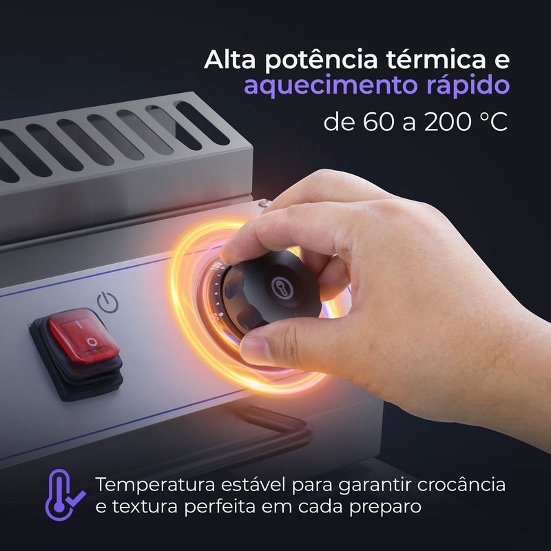 Controle térmico ajustável entre 60 e 200 °C, permitindo adaptar o ponto ideal para diferentes tipos de alimentos