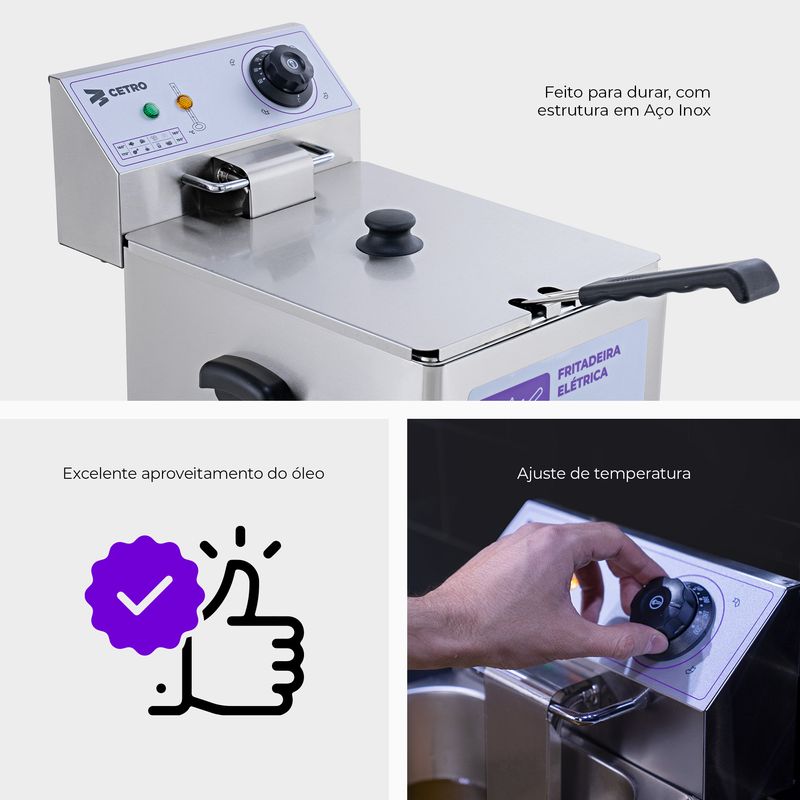 Aproveite a cuba espaçosa, a peneira com alça auxiliar e a tampa protetora da Fritadeira da Cetro para tornar os preparos mais rápidos, seguros e organizados.