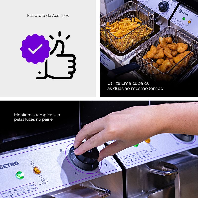 Aproveite as cubas espaçosas, as peneiras com alças auxiliares e as tampas protetoras da Fritadeira da Cetro para tornar os preparos mais rápidos, seguros e organizados.