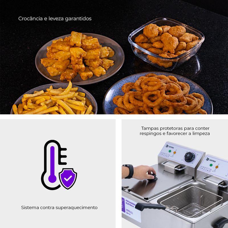 Prepare alimentos extremamente crocantes com a Fritadeira Elétrica da Cetro. O segredo de toda lanchonete, hamburgueria, restaurante ou food truck de sucesso está no sabor irresistível dos alimentos fritos no ponto certo!