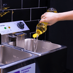 Preencha metade das cubas com óleo. Conecte a máquina a uma fonte de energia elétrica de 110 V, aperte o botão de energia para ligar e gire o controlador de cada cuba até a temperatura ideal entre 50 e 200 °C.