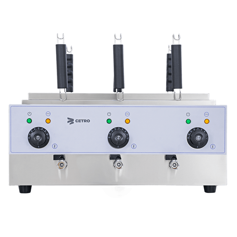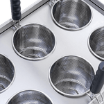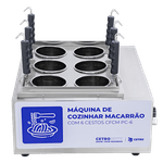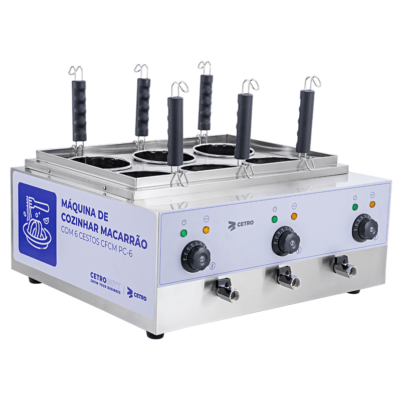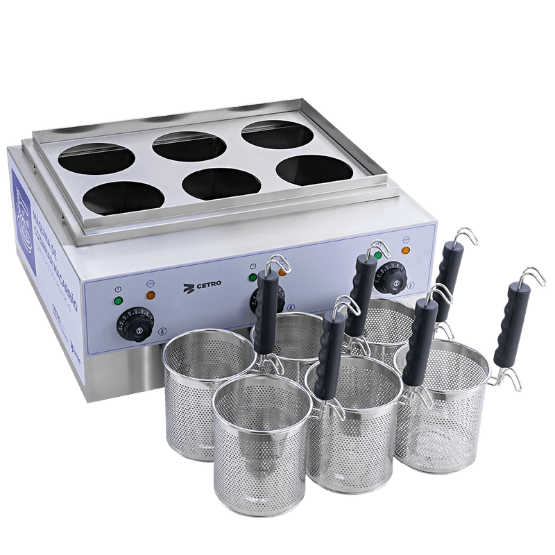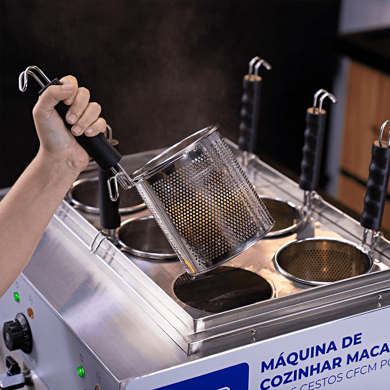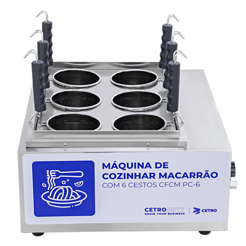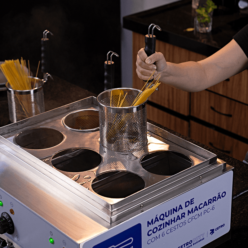 Se os pedidos surgem a todo instante, não se preocupe! A Máquina de Cozinhar Macarrão da Cetro conta com três cubas de água fervente e 6 cestos para cozinhar macarrão ao mesmo tempo.
