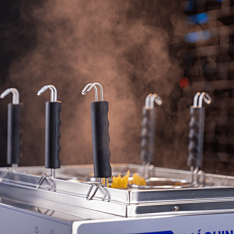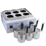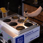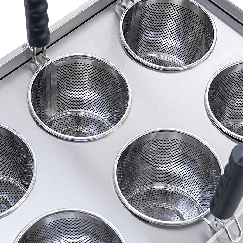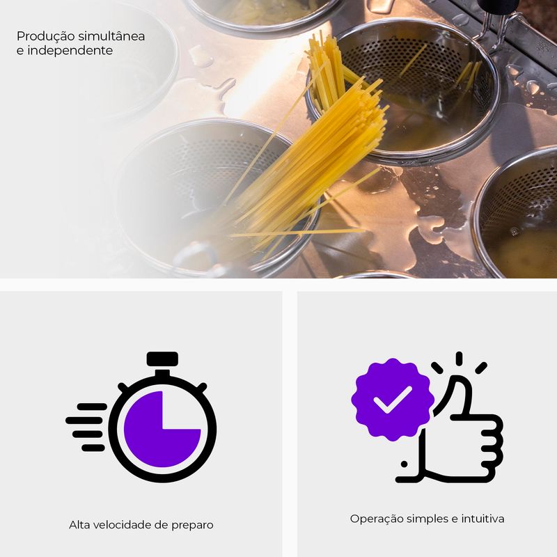 Três cubas com controle de temperatura independente e seis cestos para preparar o macarrão simultaneamente