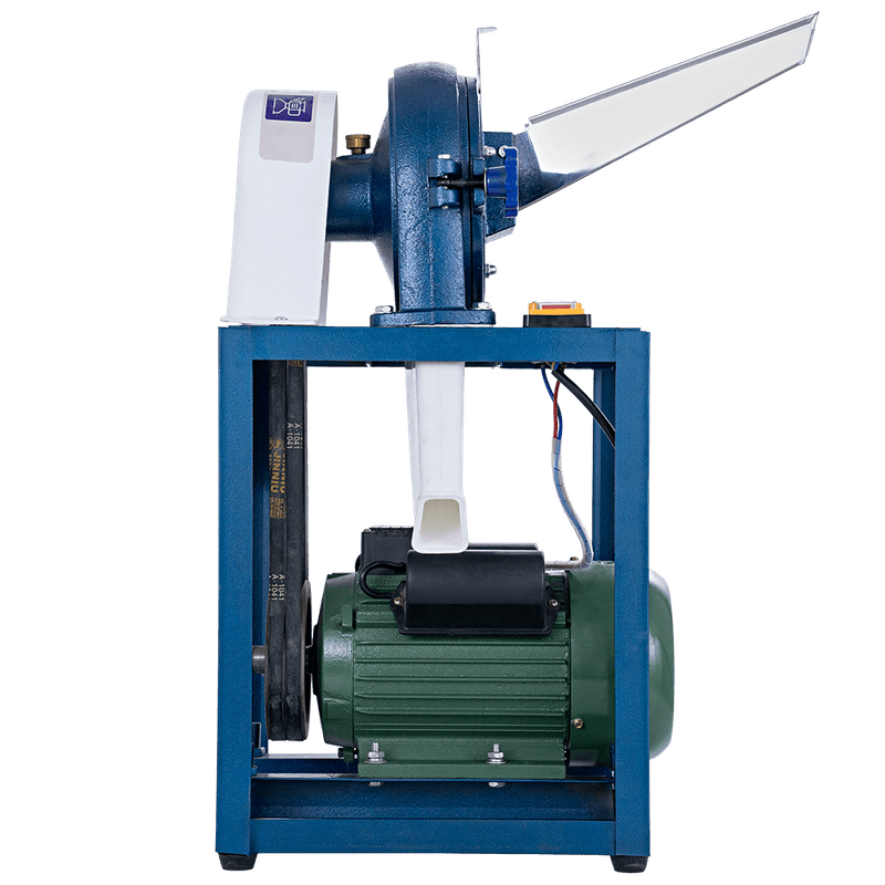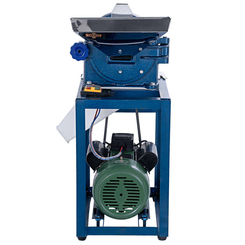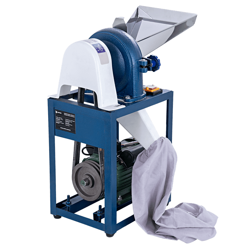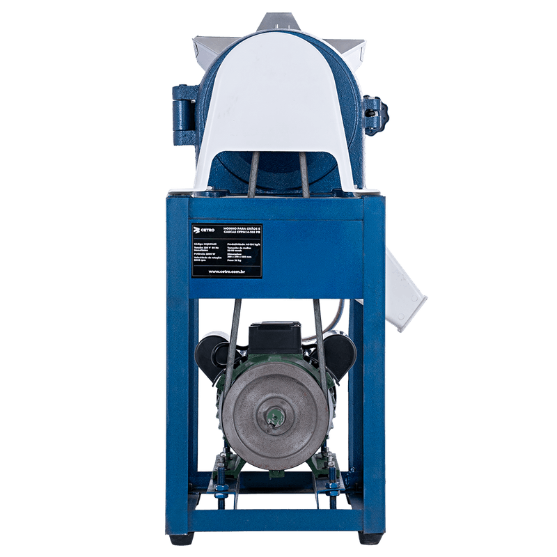 ferro fundido, o Moinho para Grãos e Cascas possui estrutura reforçada para suportar operações mais intensas. Seu motor é acoplado à base da estrutura da máquina com uma correia que se conecta ao disco de moagem localizado na parte superior.