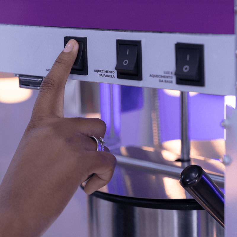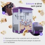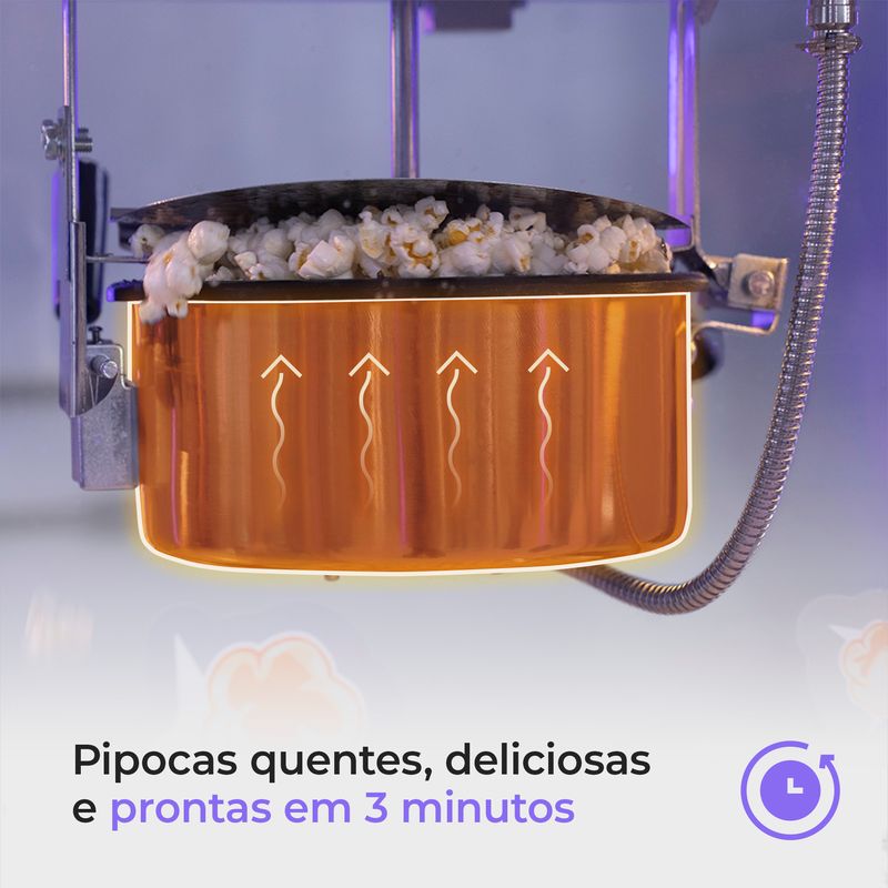 Conecte a máquina em uma fonte de energia elétrica e a ligue para aquecer seu interior. Em seguida, adicione os ingredientes, acione o equipamento e assista ao espetáculo: em apenas 3 minutos, uma panela cheia de pipoca fresca, quentinha e irresistível.