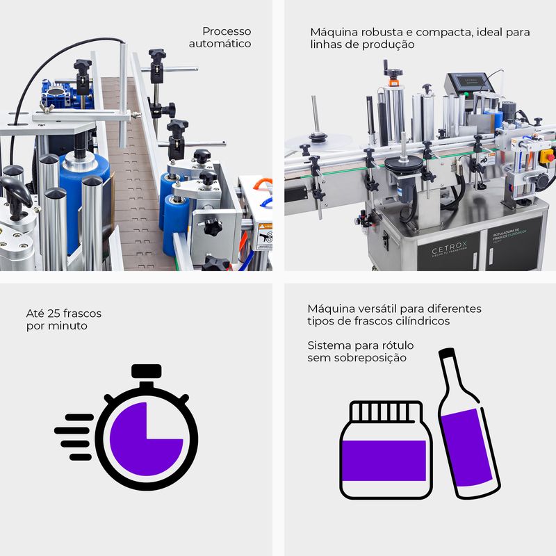 Com ajustes de velocidade de produção e de tamanho, de acordo com o diâmetro dos frascos e de altura do rótulo, a máquina tem a capacidade de se adaptar completamente ao seu processo produtivo e a embalagem que você deseja rotular, bastando ela ser cilíndrica.