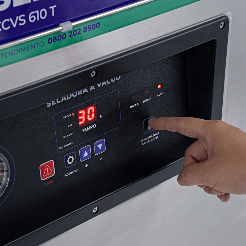 ajustes de tempo e temperatura de selagem e o acionamento de uma ou duas barras. Dessa forma, o manuseio do equipamento é simples e ágil.