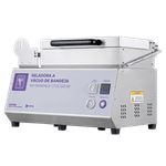 painel digital.É necessário esperar o aquecimento das resistências e posicionar as bandejas com o produto no molde. Depois, é só puxar o filme sobre as bandejas até cobrir toda a câmara e fechá-la. Quando o processo de selagem for finalizado, é necessário cortar o filme para separar as bandejas e retirar o excesso de plástico.
